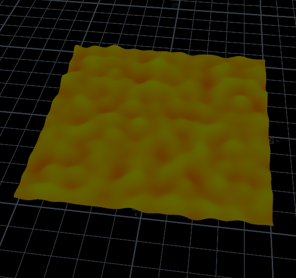 이번 시간에 계속 @Cd로 noise()의 특성을 선보였던것과 달리 이번에는 @P에 값들을 저장하여 보니 grid가 noise의 방식대로 grid를 구성하는 모든 포인트들이 랜덤하게 3D상에서 값들을 설정하여 구겨진 쉐입을 형성하였다.