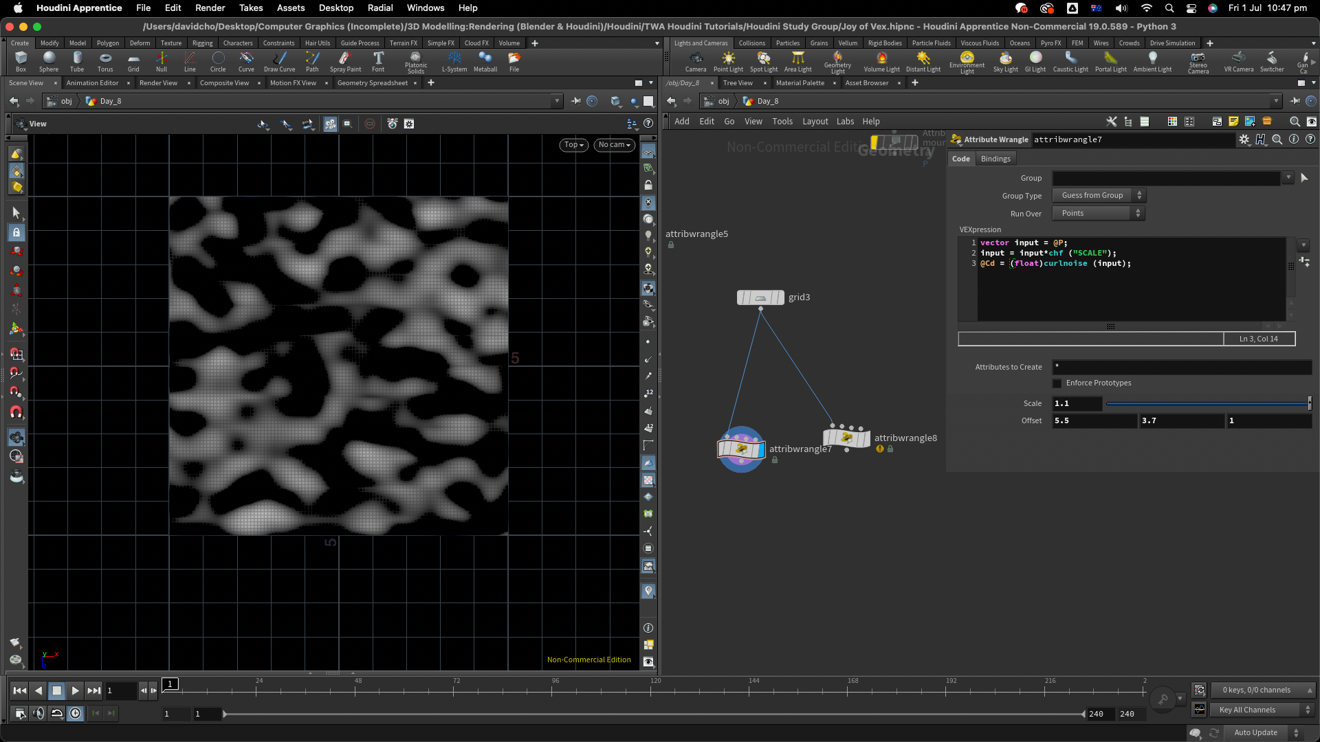 @Cd *= chf("GRAYSCALE"); // 이렇게 하여 따로따로 계산하면 흑백으로 변환이 되지 않는 다는 것이었다. 노이즈 자체에 차원 개념으로 곱해주는 건지 컬러값을 3D로 곱해주는 건지 즉 noise function을 사용하고 세미클론 전까지 1d float 값을 곱해주었냐 3d vector값을 곱해주었냐가 wrangle에서 구분하는 척도인지.