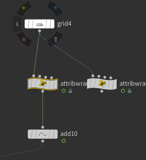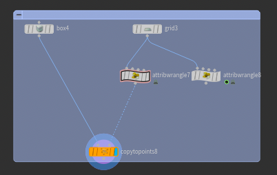 그리고 copy to points의 1번 인풋에 들어갈 포인트들을 꾸며주기 위해 attribute wrangle로 코드를 장식하여 위치와 모션을 꾸며주기로 하였다. 그리고 마지막에 add를 통해 grid의 프리미티브를 전부 지우고 포인트만 남겨주기로 설정하였다.