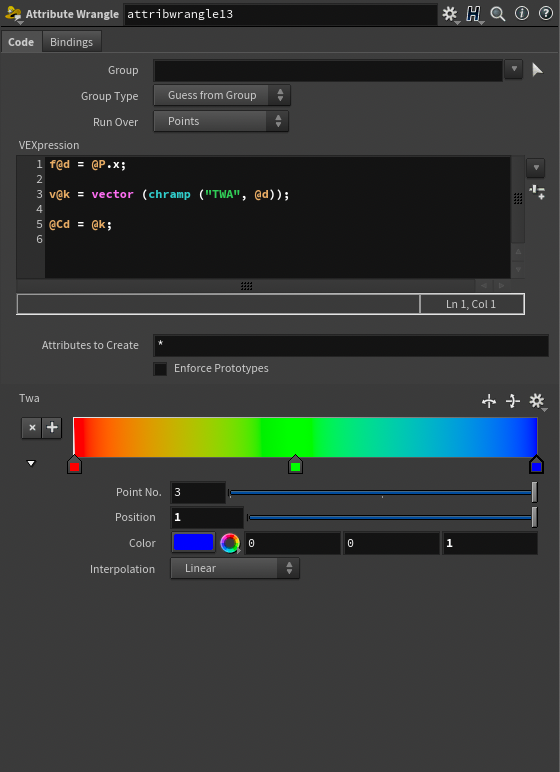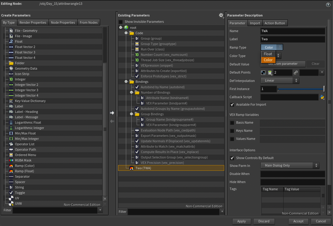 - Attribute Wrangle -> Edit Parameter Interface -> Existing Parameters -> Ramp -> Parameter Description -> Parameter -> Ramp Type