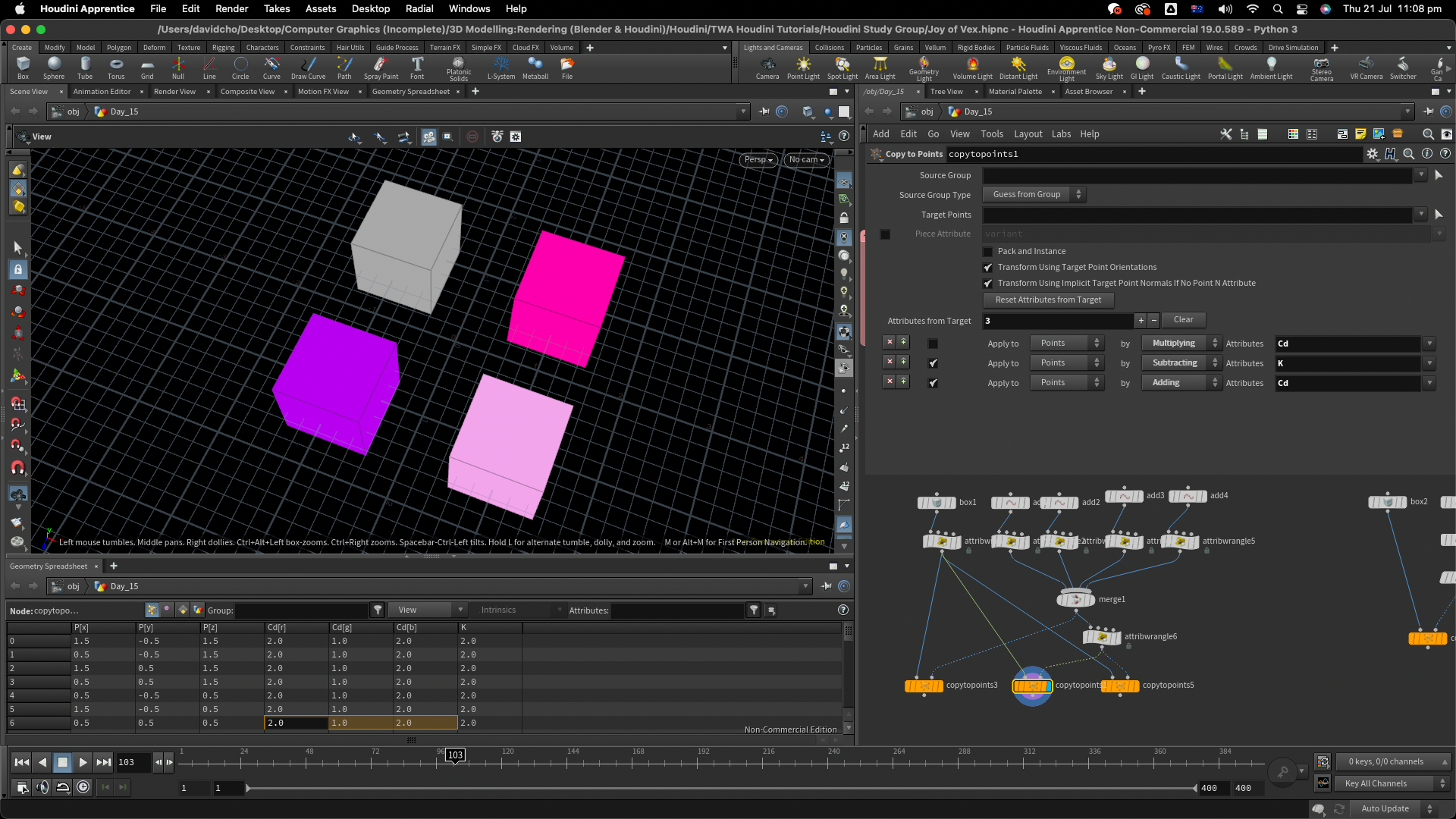 참 강의를 들을때는 생각보다 쉽고 이해가 되는 것 같은데 exercise로 넘어가서 직접 문제를 풀어볼때 머리가 막히는 것을 많이 느끼는 것같다. exercises시간이 두려워지는 것은 오직 나뿐인가...? 하기싫은 유산소운동을 하는 느낌이다.... 그래도 실력이 늘려면 시도해봐야 겠다는 생각에 꾸역꾸역 시간을 투자해서라도 코드를 작성하고는 있다. 어쨌든 오늘 배운 Copy to points는 내가 제일 좋아하는 노드였다. 뭔가 geometry가 모든 포인트의 위치에 카피되는 것이 웃기기도 하고 재밌기도 하였다. 그리고 카피만 되는 줄 알 았는데 포인트의 해당 attribute들이 geometry의 attribute과 카피/곱셉/덧셉/뺄셈 등이 되는 사실을 알고나니 생각보다 노드의 쓰임세가 많구나라는 것을 깨닫게 되었다. 그리고 강의에서 rigid body에 대해 짤막하게 언급되었는데 그때 @pscale, @scale과 같은 point orientation attribute들이 사용된다는 사실이 신기하기도 하고 아직은 제대로 감이 잡히지는 않았다. 그리고 각기 포인트들에 vex를 작성해주어 특정 모션을 취해주게 한 다음 geometry를 copy to points에 연결해주어 같이 모션에 따라 움직이게 만드는 것이 특이하기도 하고 재밌었던 것 같다. 점차적으로 코드를 읽는 것 뿐만이 아닌 직접 작성하는 시간을 갖는것의 중요성에 있어서 생각하게 만드는 오늘 강의였던 것 같다. vex 생각보다 쉽네 이러고 있었는데 갈수록 배운것들을 다 종합하자니 머리가 지끈지끈해지는것 같다. 계속 계속 연구해보고 공부해야 할 것 같다.