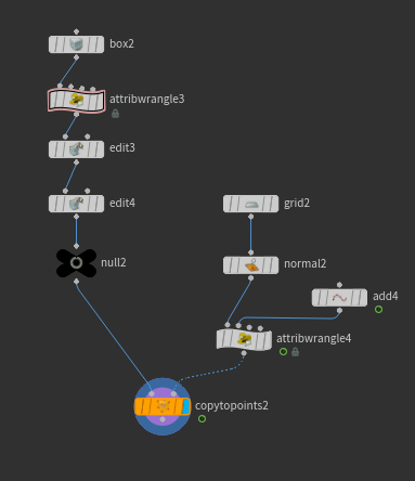 그다음 grid에서 normal 노드를 붙여 포인트로부터 normal방향이 지정되게끔 바꿔준 다음 wrangle 노드를 붙였다. 그다음 또 다른 add로 만든 포인트 노드를 동일한 wrangle 노드의 1번 인풋으로 연결하여 box의 머리 방향에 변화를 주게끔 하였다.