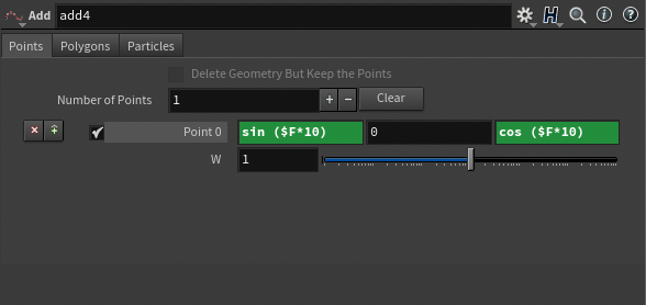 나는 좀더 동적인 모션을 구축해보기 위해 아래와 같이 첫번째 wrangle노드가 연결된 add노드 안에 포인트의 x과 z값에 이러한 식을 써넣어두었다.