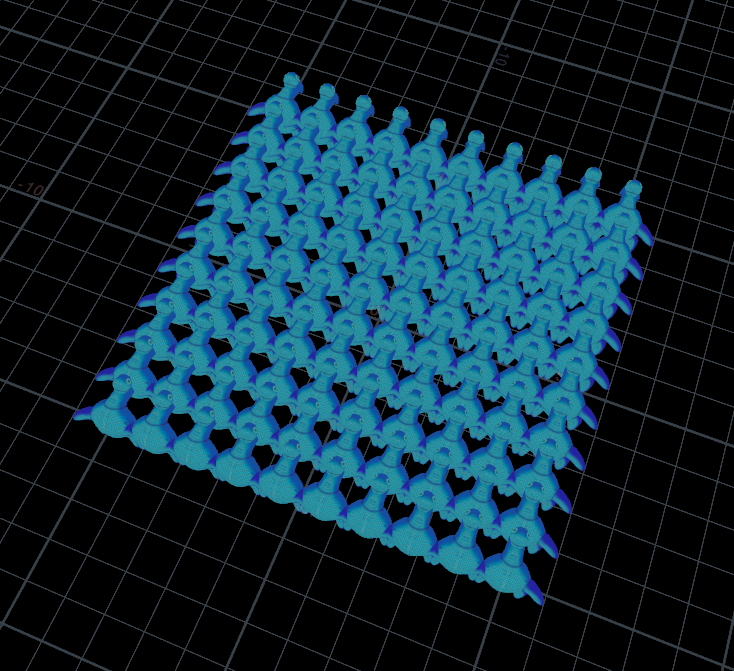 그치만 위의 예시와는 다르게 grid같이 normal값을 가진 geometry를 구성하는 점들에 특정 geometry를 카피시키기 위해 copy to points를 이용한다면 grid의 모든 포인트의 노멀값이 {0, 1, 0}으로 구성되어있기 때문에 이렇게 y값을 향한 방향으로 보이게 되는 현상을 나타낸다.