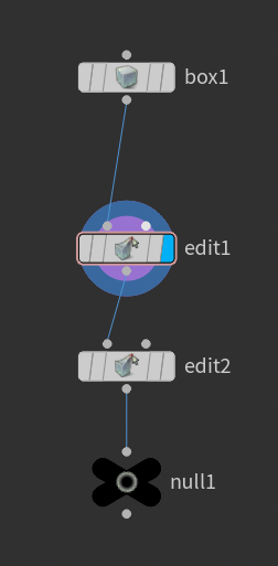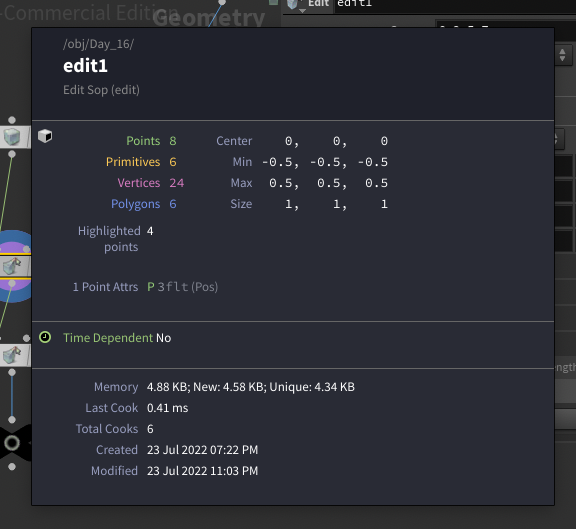 이때 이러한 방법으로 생성하면 저절로 geometry 노드 아래 edit 노드가 연결되는데 이 노드를 그냥 남겨두면 scene view에서 선택한 포인트 혹은 프리미티브가 노란색으로 띄게 남겨진다. 이는 노드 정보에서 볼수 있듯이 highlighted points/primitives가 적혀있기 때문인데 이를 없애기 위해 아무것도 적용이 되지 않된 edit노드를 한번 더 연결해준뒤 null 노드를 연결하면 사라지는 것을 알 수 있다.
