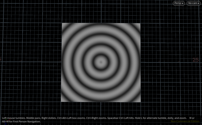 @Cd = (sin (dist) + 1)*0.5; // sine function을 활용하여 vector (1, 0, 3)의 위치에서 뿜어져 나오는 파동을 형성하고 뒤에 따라오는 상수들의 계산들을 통해 전반적인 색상을 조정함. 아까도 언급했듯이 이것은 fit function으로 더욱 알아보기 쉽게 조정 가능.