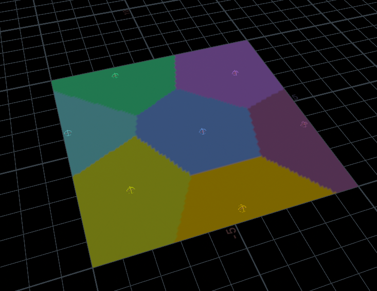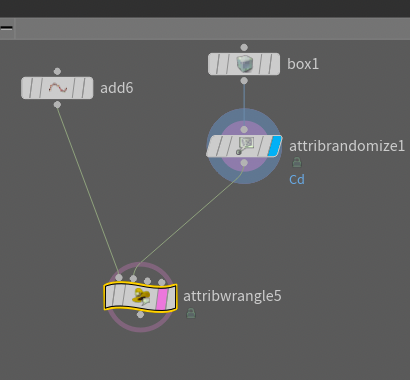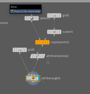 xyzdist()와 primuv()을 둘 다 사용하여 Day7때 nearpoint()를 배웠을때 처럼 grid를 구역별로 나뉘어 색깔을 알맞게 칠해줄 수 있다. 우선 아래와 같이 grid를 scatter로 점들로 흩어지게끔 만든다음 copytopoints로 sphere로 점들의 위치에 카피하여 attribute randomize로 sphere의 색깔을 다채롭게 정해주었다. 그다음 wrangle노드로 grid를 0번 인풋으로 연결하고 sphere들이 있는 노드를 1번 인풋에 연결하여 grid를 이루는 프리미티브들이 각각 가장 가까운 sphere의 색상과 동일하게 색을 이루도록 설정하도록 하였다.
