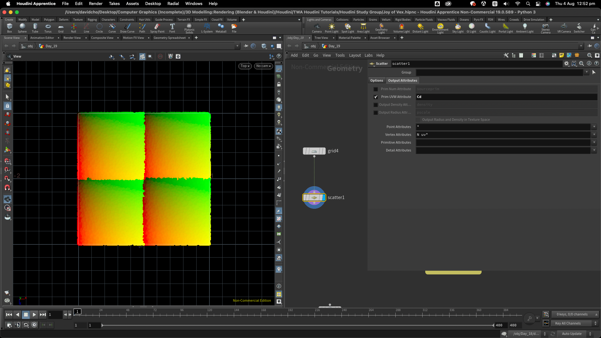 위에서 설명한것 처럼 uv값은 오직 하나의 프리미티브를 가로세로 값으로 비율을 계산하여 생성되는데 이는 이와 같은 실험으로도 알 수 있었다. grid에 scatter을 연결하여 포인트들로 만든 후에 scatter의 output attribute 메뉴로 가 Prim UVW Attribute로 가 Cd 색깔값으로 설정해주면 프리미티브 상에서 아래로 갈수록 uv vector상 (1, 0, 0)값이 강해지고 오른쪽으로 갈 수록 uv vector상 (0, 1, 0)값이 강해져 각각 색깔값 (RGB)의 맞게 빨간색 그리고 초록색을 띄는 것을 알 수 있었다.