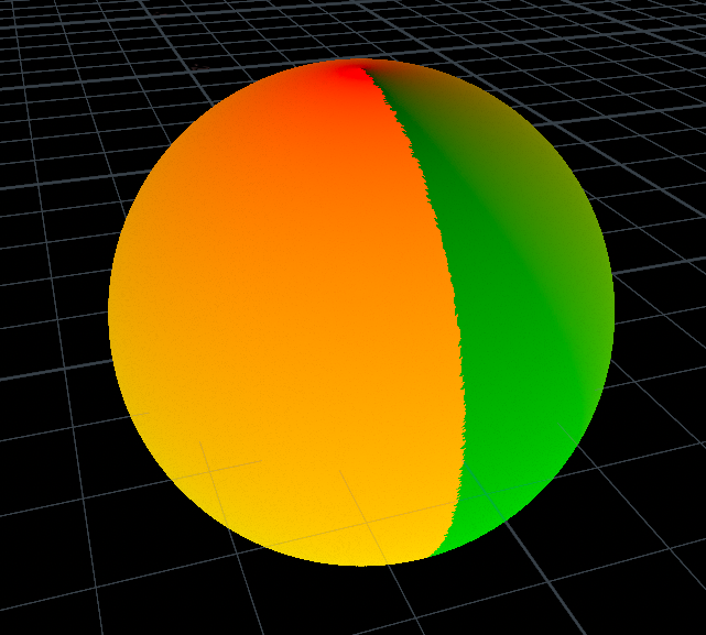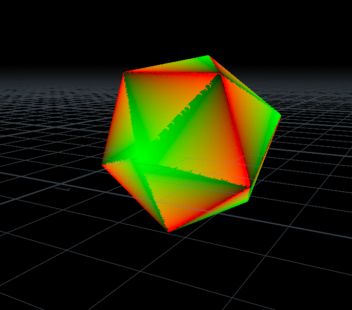 이를 많은 삼각형으로 이루어진 sphere에다 적용하면 이와 같은 모양이 나오는데 이도 동일하게 각각의 uv값에 알맞게 @Cd 색깔값들이 형성된것을 알 수 있다. 이때 만약 rubbertoy에 원운동을 시킨다면 프리미티브 하나가 아닌 두개의 삼각형으로 이루어진 평행사변형위에서 찌그러진 모양을 하여 원운동을 하게 된다는 사실을 알 수 있었다.