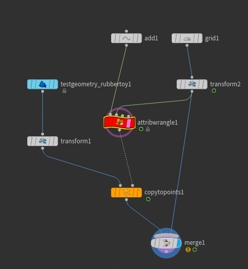 이때 아래와 같은 노드를 구성해주어 grid가 transform으로 움직이게 만들어서 같이 wrangle노드에 연결된 포인트가 유저가 파라미터로 지정한 uv의 위치에서 grid의 모션과 동일하게 나오게 해준다. 그때 copy to points로 연결된 rubbertoy가 포인트의 위치에 카피될수 있도록 하고 이들을 grid와 merge로 묶어서 rubbertoy가 grid의 모션에 둥둥 떠나니게끔 세팅하였다. 이때 @P는 포인트의 위치라 유저가 grid상에서 rubbertoy가 어디 위치해 있을지 결정해주고 @N는 노멀값이라 grid가 움직일때 rubbertoy도 grid가 움직일때의 방향과 동일하게끔 향하게끔 설정하였다. 이때 rubbertoy가 배까고 누워있는 것을 볼 수 있는데 이는 grid의 normal값이 (0, 1, 0)인데 rubbertoy의 노멀값을 동일하게 설정하면 배까고 누워있게 된다. 이를 보완하기 위해 transform을 rubbertoy에 연결해 rotation값의 x값을 90도 돌려주었다.