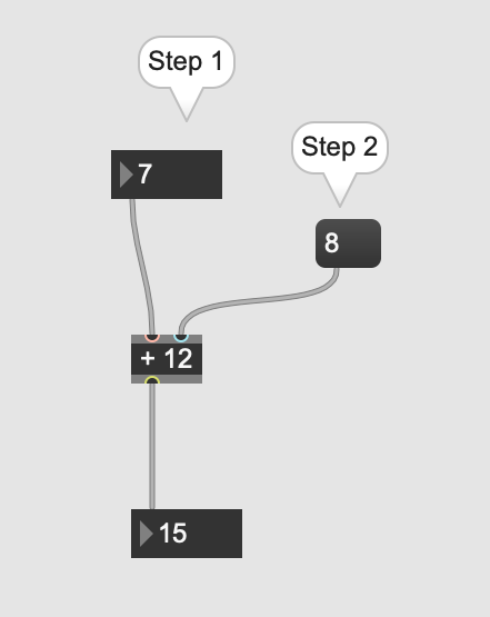 이 사진을 보면 object로 들어오는 값이 각각 7과 8인 것을 알 수 있다. 그리고 Object안에 있는 숫자는 + 12라고 적혀있는 것을 알 수 있다. 만약 그렇다는 것은 기존에 +12로 설정되어있던 값이 위의 7과 8이라는 새로운 숫자에게 덮어씌여져 더이상 argument로서 작동을 하지 않은 것을 볼 수 있다. 그러므로 결과값으로 기존에 있던 12는 사라지고 7과 8이 각각 만나 그 다음 object name인 +로 결합되어 각기 수가 더해져 15라는 결과값을 나타내는 것으로 볼 수 있다. 그러면 Object상에서 12가 사라졌다는 것을 디스플레이 해야하는데 그대로 12로 나타나있는 것을 알 수 있다. 그러므로 알 수 있는 사실은 object안에 있는 argument가 다른 숫자들로 인해 덮어씌여져도 바뀌어 지지 않고 그대로 현재 입력된 argument를 나타내는 것을 알 수 있다.