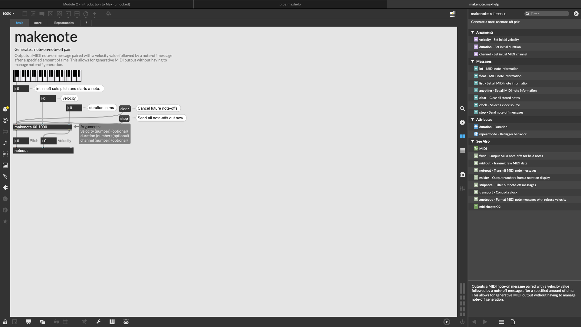이 챕터를 통해 Max의 기본 인터페이스와 기초적인 작동방식을 알아보았다. 다음 챕터를 통해 본격적인 MIDI를 사용한 작업을 통해 음향적으로 어떠한 결과물을 낼 수 있는지 알아보겠다.