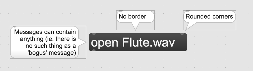 Message는 inlet을 통해 받은 정보를 바꾸지 않는다는 점에서 Object과 다르게 작동한다. Message의 목적은 object에게 명령/지침을 내리는데 있고 object들에게 특정 message를 수행하고 있다는 점을 알려준다. Message는 말 그대로 box안에 아무거나 쓸 수 있으며 잠긴 patcher에서 유저가 클릭을 하거나 Bang이라는 수신호를 전달하게끔 할 수 있게 만든다. Max안에 있는 콘솔을 통해 message가 똑바로 전달되었는지 확인도 가능하다.