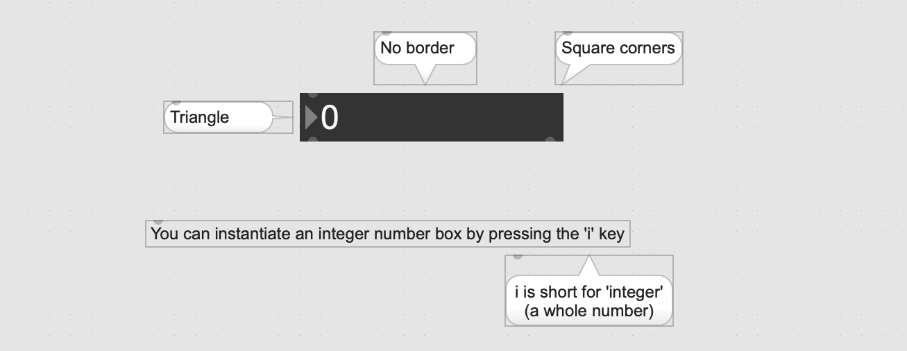 Message와는 다르게 Number들은 patch를 껐다 키면 모든것이 초기화됨으로 유저들은 주의를 요구한다. 이는 message와는 다르게 특정 정보를 담아주는 역할을 하는대신 Number element를 통해 유저가 직접 UI object다루듯이 조절할 수 있는 목적으로 작동됨으로 중요한 수들을 저장하기 위해서는 number이 아닌 message를 사용해야 한다. (Number은 마치 후디니와 유니티에서 다루었던 tunable parameter들처럼 값들을 유동적으로 조절시키는 목적으로 사용된다). 후에 얘기할 내용이지만 Number box는 integer/float등 수들의 형태의 따라 종류가 여러가지 있으며 각기 목적에 따라 알맞는 타입을 설정할 수 있다.