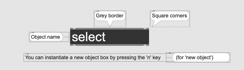 우선 기본적으로 Object의 정보들을 모두 담고 있는 형태를 Object box라고 부른다. 이때 Object Box안에 무엇을 써 넣는가에 따라 어떠한 Object가 생성될것인지 결정하는 계기가 된다. 이때 Object안에 들어가는 것들은 짧은 영단어 하나와 숫자가 들어가는 형태로 이루어진다. 이때 영단어 하나는 Object name이 될것이고 숫자는 Argument라고 불러지게 될 것이다. 이때 Argument는 주로 이 특정 object가 어떠한 방식으로 작동될것인지 결정하는 요인이 된다. Object는 아무 단어를 허용하지 않으며 Max상에서 지정된 특정 Object name만 받아들여 온전한 Object를 생성할 수 있다. 그렇지 않으면 Object상에서 유저가 써넣은 단어를 이해하지 못해 오류가 날것이며 이는 Object가 오렌지 색깔로 바뀌어 에러가 나는 상황을 초래할 것이다. 이러한 Max가 인식을 하지 못하는 Object을 Bogus Object이라고 부른다. 그말인 즉슨 Object Name을 작성할 때 스펠링 에러를 조심하여 작성하여야 한다. (만약 Vex를 공부한 후디니 유저라면 Object가 마치 Vex에서 보는 Function 즉 함수의 개념과 동일하다는 것을 계속 진도를 나아갔을시에 공감을 할 것 이다. 그말인즉슨 Vex의 visual programming적인 VOP과 Max에서 다뤄지는 patcher상안의 내용은 매우 닮아있을 것이며 배우는데 있어 더욱 수월해짐을 느낄것이다.)
