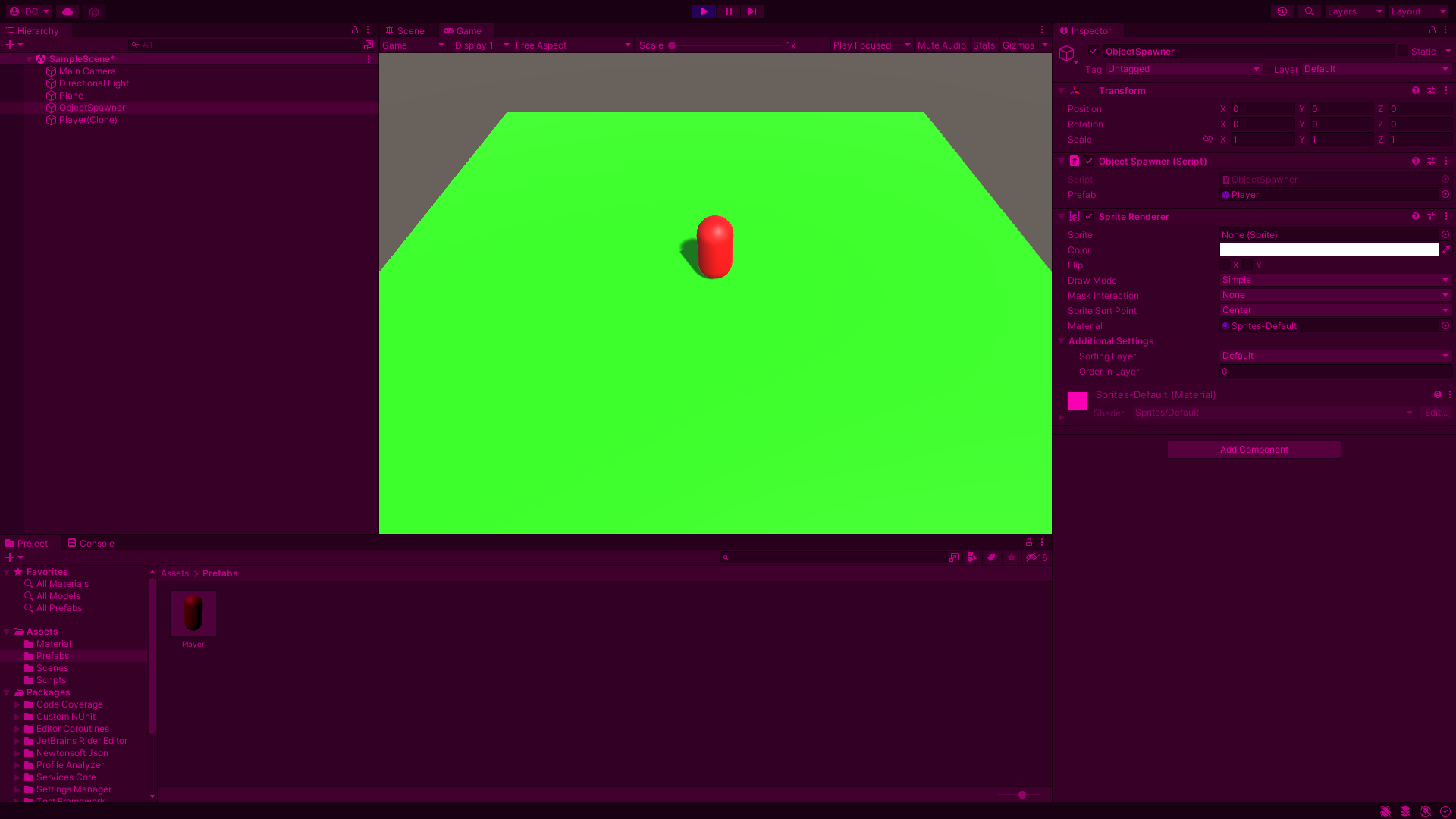 그 다음 다음과 같이 Project View로 생성한 Player의 Prefab을 Object Spawner 스크립트 안 prefab이라는 파라미터로 드래그 & 드롭 해주어야 한다. 이때 내가 자주 했던 실수는 드래그 & 드롭을 해주지 않고 그대로 파라미터를 선택하여 Scene View에만 있는 GameObject만 선택하여 Prefab으로 설정하지 않은 실수를 저질렀다.