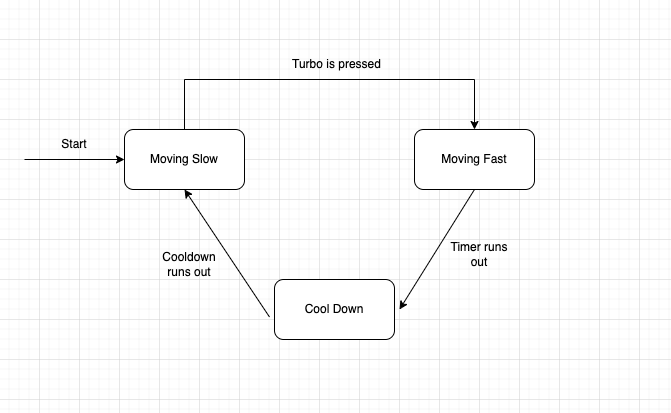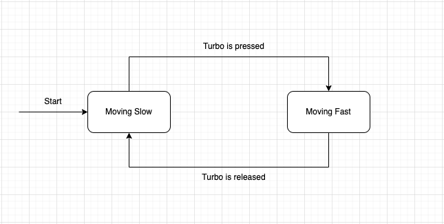 이때 앞서 설명한 FSM을 사용하여 Turbo Boost (가속도)가 생기는 간단한 게임의 한 특징을 코드로써 구현할 수 있다. 우리가 원하는 방향은 Turbo키가 눌러졌을때 Player의 속도가 빨라지고 때졌을때 속도가 원상복귀 되는 그러한 게임을 만들고자 한다.