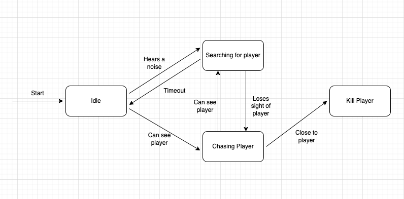 위 그래프를 기반으로 FSM을 완성해보자면 다음과 같이 만들어 줄 수 있다. 각기 Event (Transition)에 따라 State가 다른 State로 변하는 것을 알 수 있고 이 FSM을 코드로 완성해 보려면은 State를 활용한 Switch statement와 Enumerations의 활용을 적극적으로 권장하는 바이다.