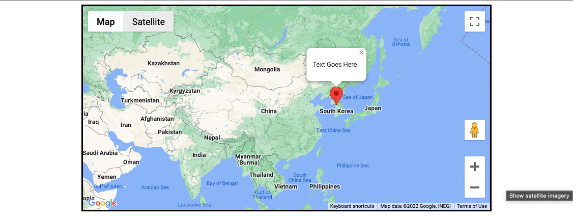 아래에서 보이는 코드 중 'content' 옵션은 하이퍼링크나 이미지를 그 부분안에 암호화 하여 집어넣어주게 만드는 옵션이다. 이러한 content가 삽입된 요소를 클릭했을씨 'openInfoWindow' 옵션을 통해 팝업처럼 나타나도록 세팅을 해줄 수 있게끔 만들어 보았다. 방금 전 코드를 입력했을시 유저가 마커를 클릭했을때 텍스트 블럭이 뜨면서 Text Goes Here과 같은 말이 뜨는 것을 알 수 있다.