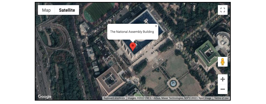 // 해당 지도안에 클릭된 위치에 (this) 'The National Assembly Building'이라는 메세지를 가진 윈도우창을 띄우거라