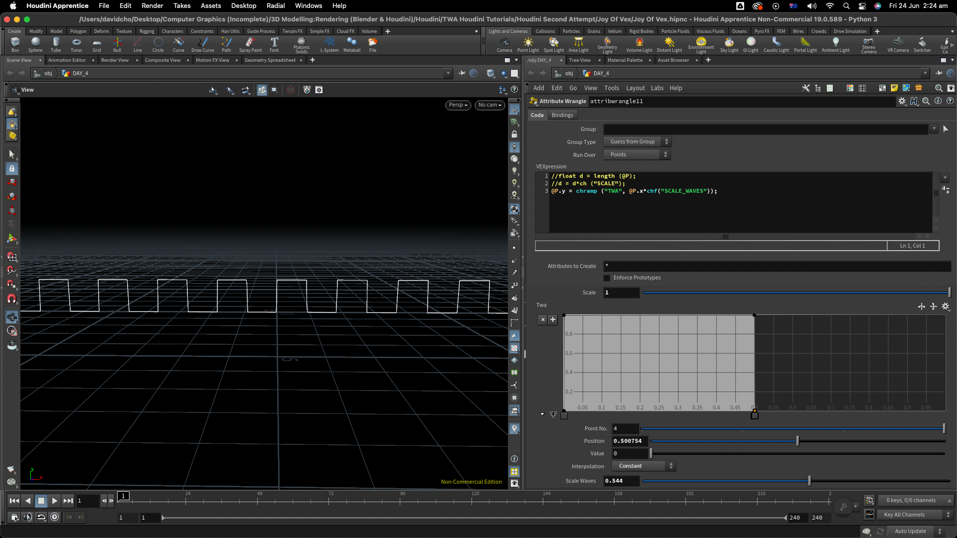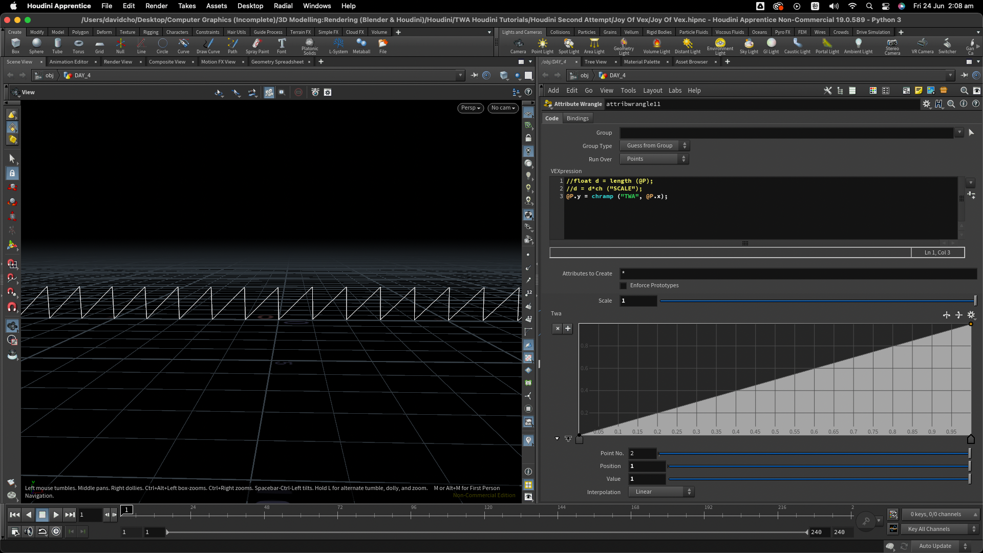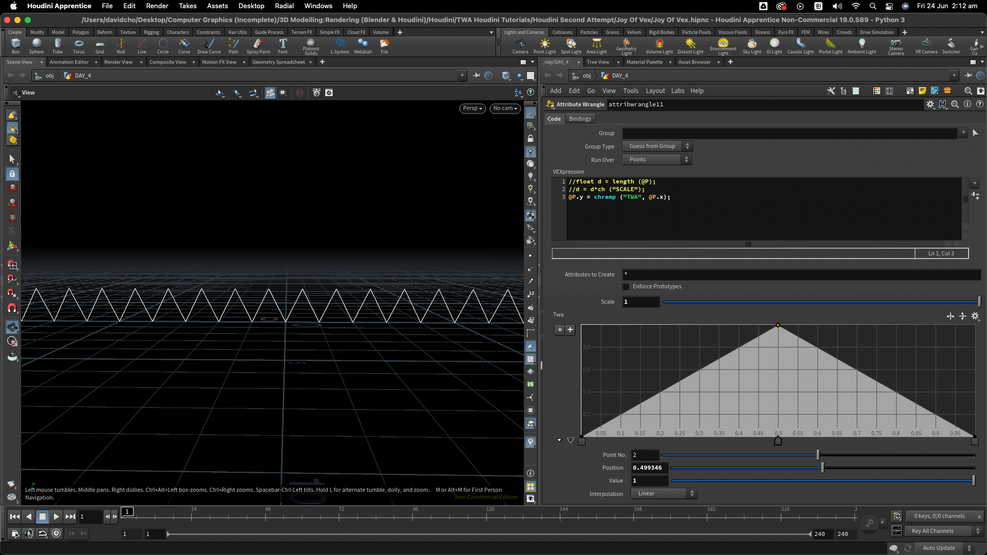 @P.y = chramp ("TWA", @P.x*chf ("RAMPSCALE")); // 간단하게 한줄 식을 사용하였다. length()를 사용하여 새로운 variable d 에 집어넣지 않은 이유는 음수의 거리 길이로 인한 절댓값을 피하기 위함이었다. 그러므로인해 데칼코마니 같은 모양의 웨이브를 피할 수 있었다. 또한 @P.x 값에 chf()을 곱하여 간격을 조정할 수 있게끔 설정 하였다.