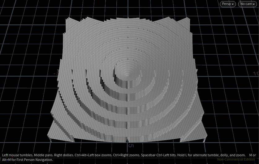 @P.y = chramp ("YRAMP", d); // chramp방식을 적용한 식, 원점을 중심으로 올라가다가 다시 내려가고 또 올라가는 형태가 반복되는 형태로 나타나기 시작함. 그리고 나는 chramp()의 parameter에 있는 ramp 그래프는 정확히 0에서 1까지의 구간까지만을 의미하는 것을 알기 시작했고 이 구간보다 큰 값을 (예 - 이 식에는 @P.y) 가진 geometry는 ramp가 반복되는 형태로 나타나진다는 사실을 깨달음.