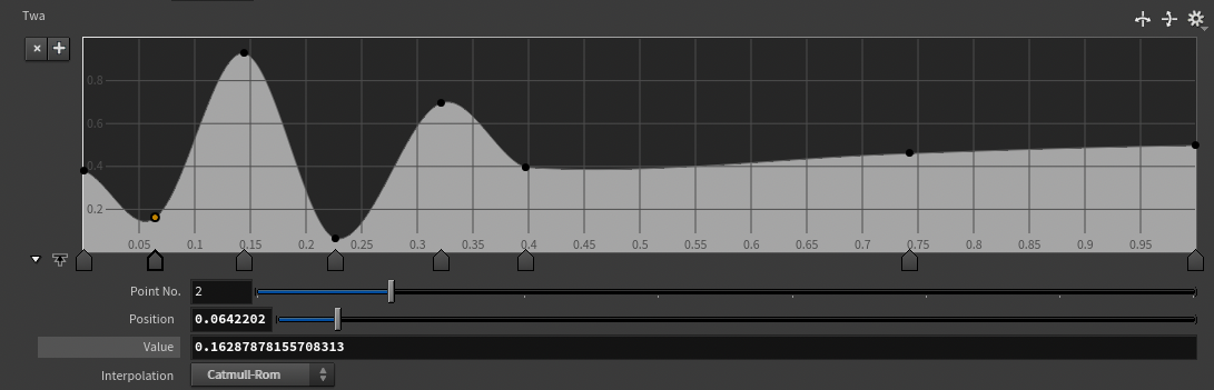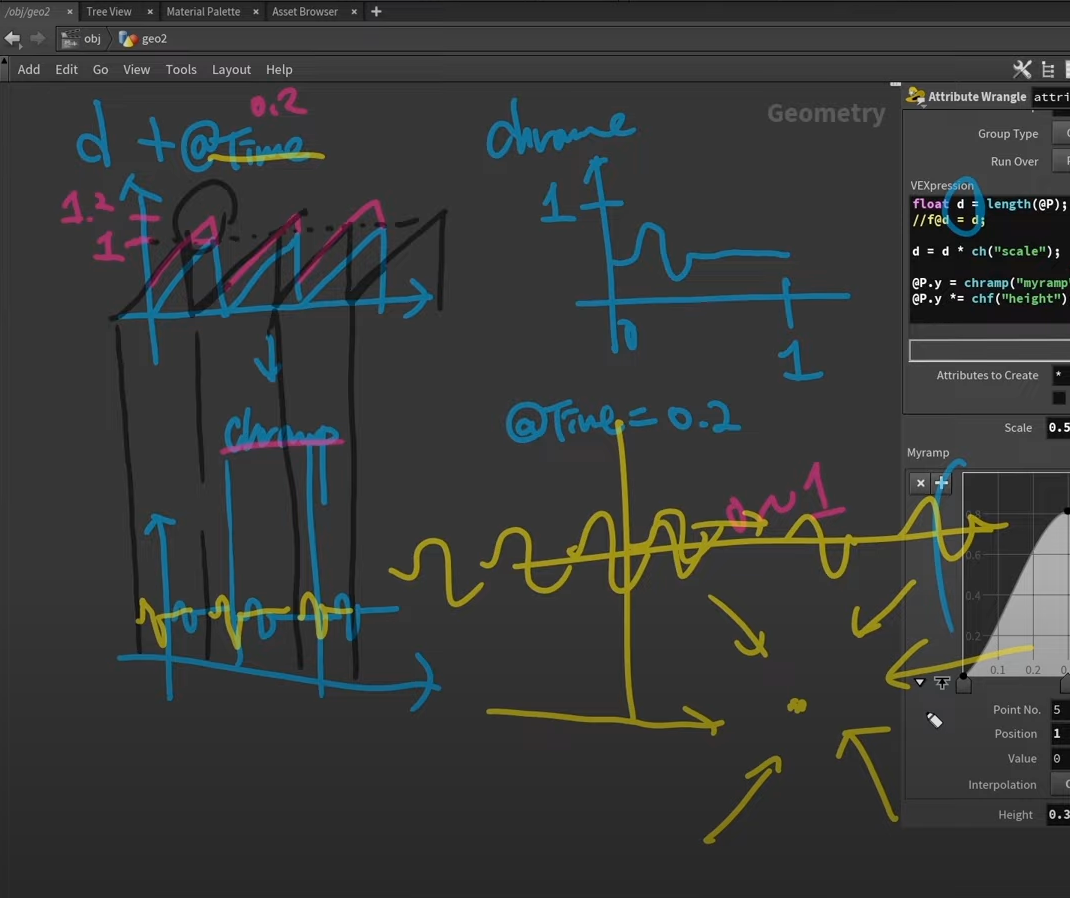 eg) @P.y = chramp ("TWARAMP", @P.y); // @P.y attribute에 해당하는 파형을 직접 그릴 수 있게 하는 parameter를 생성하여라. chramp()에 있는 모양을 만들어 줌으로써 각각에 대응되는 정보가 @P.y 높이값으로써 저장이 되어있는 것을 알 수 있다.