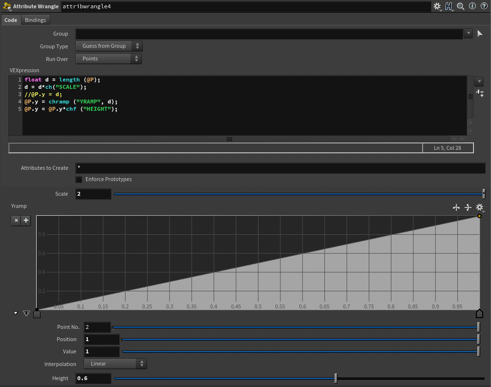 @P.y *= chf ("HEIGHT"); // 그후 @P.y에 ch()을 곱하여 높이값을 조절할수 있게끔 세팅하였다.
