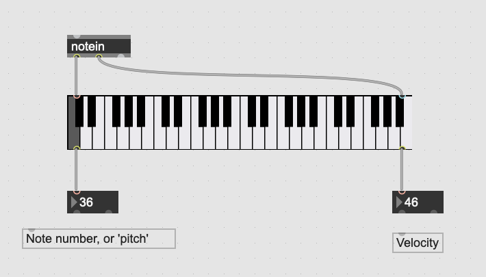유저가 만약 MIDI Keyboard를 사용하여 악보를 연주할 때 들어오는 값들을 Max상에서는 notein 이라는 object을 통해 받아줄 수 있다. notein object은 세 가지의 기본적인 outlet을 가지며 다음과 같은 정보들을 내보내준다.