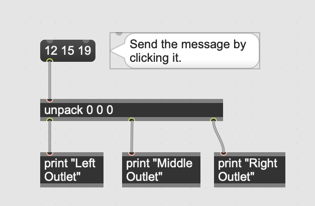 이 때 윗 사진에서 볼 수 있듯이 unpack이라고 적힌 object은 여러개의 개별 요소들이 한꺼번에 들어갔을때 쪼개주는 역할을 해준다. unpack이 내보내는 output들의 수들 즉 outlet의 수는 unpack다음에 쓰여지는 argument의 수로 결정된다. (e.g. 0 0 0 -> 세 개의 arguments). 이때 중요한 사실 두개는 다음과 같다.
