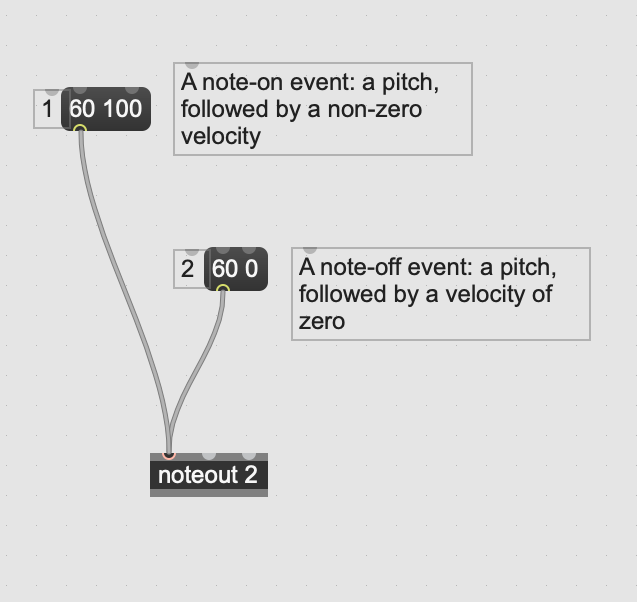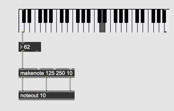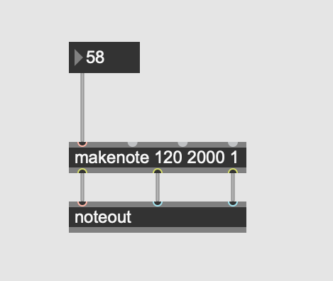 이 때 음에다가 시작하고 멈추고를 계속해서 명령하는 것은 힘들 수 있다. 이를 해결하기 위해 makenote object을 쓸 수 있는데 기본적으로 2개에서 3개의 argument를 집어넣어 음의 볼륨과 길이 (miliseconds) 를 각각 설정해줄 수 있다. 지정한 음의 길이를 전부 재생하고나면 makenote object은 note-off event를 시행하여 음의 velocity를 0으로 바꾸어 재생을 멈춘다.