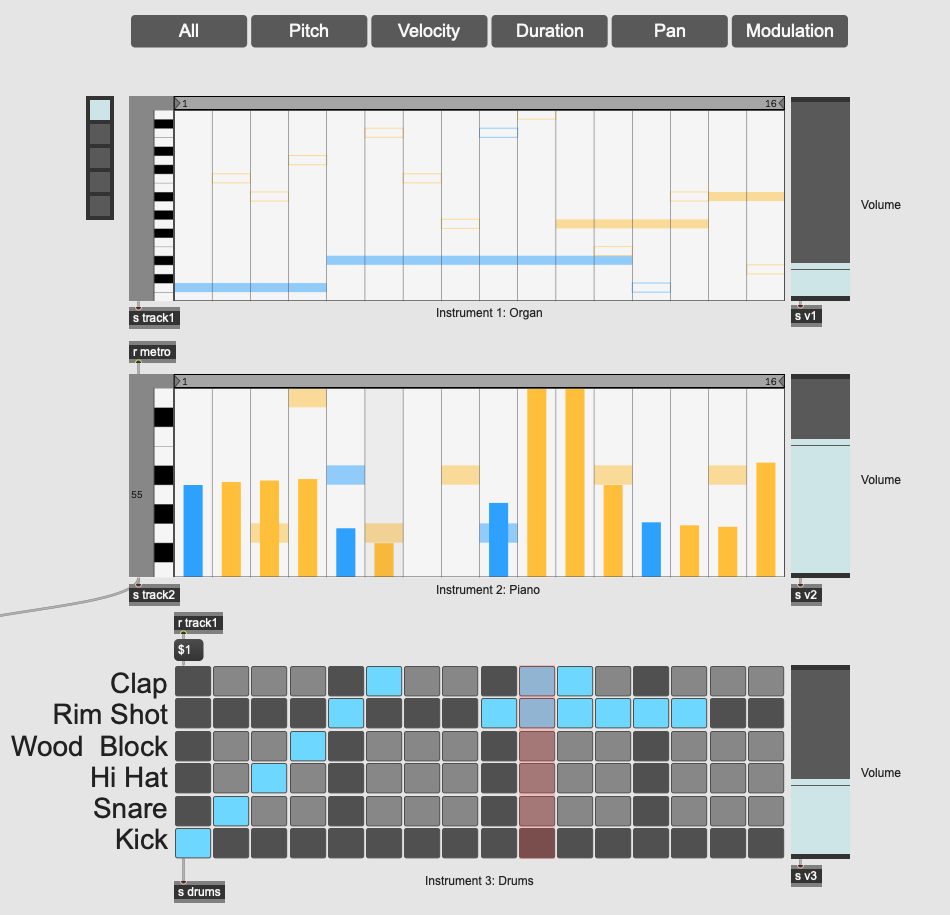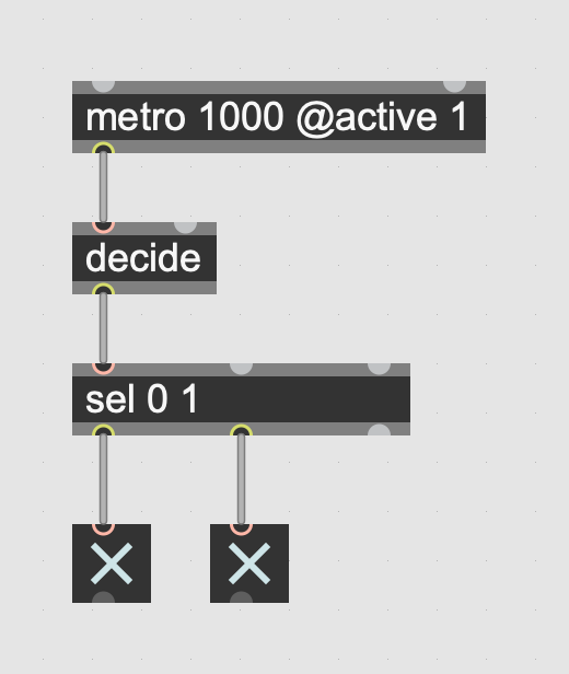 위의 pitch를 내보내어 makenote object을 통해 125의 velocity와 250ms의 길이로 설정해준다음 10으로 channel을 지정하여 타악기 종류의 오디오를 내보낼 수 있게 할 수 있다.