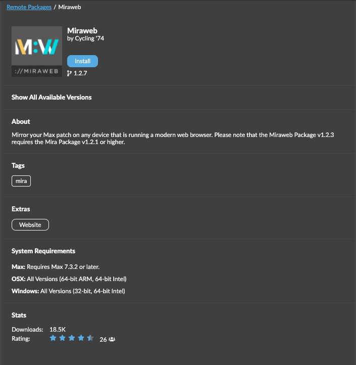 Cycling 74에서는 Miraweb이라는 패키지를 만들어 유저들에게 웹브라우저와 함께 있는 어느 디지털 device를 가지고 Max를 연결할 수 있게끔 하였다. Miraweb을 사용하기 위해서는 File 메뉴에서 Show Package Manager를 클릭한다음 Miraweb을 검색하여 다운받아야 한다.