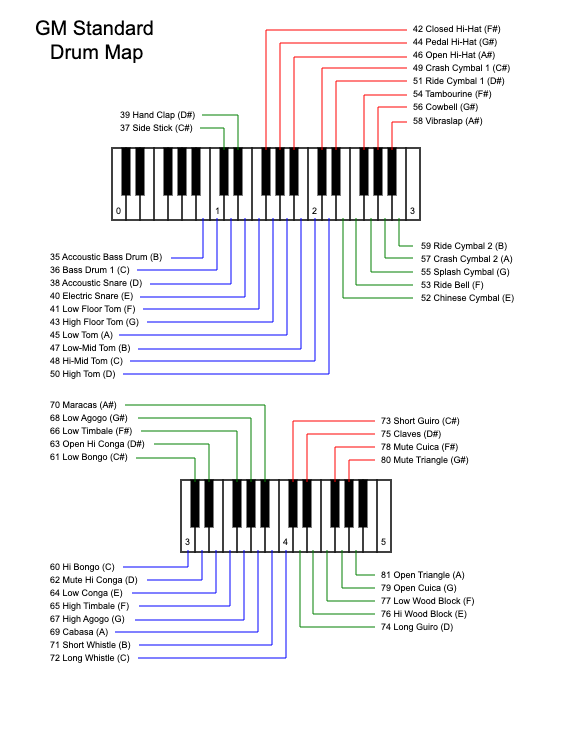 일번적인 MIDI는 타악기/드럼같은 소리를 내기 위해 channel 번호 10을 사용한다. 일반적인 컴퓨터의 synthesiser는 일반적인 MIDI의 사운드세트를 이용하며 타악기 소리를 Max에서 구현하기 위해서는 notein object을 사용해 10으로 channel argument를 설정하거나 makenote object를 사용하여 또한 마찬가지로 세 번째 argument에 10을 집어넣어 타악기만 나오게끔 세팅해 줄 수 있다.
