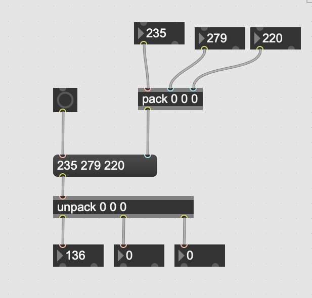 이때 아래의 예시와 같이 object들을 구성하였을때 각각의 숫자들이 pack object으로부터 모아진 다음 message로 전달되어 버튼이 눌러졌을 때 unpack이라는 object를 통해 다시 흩어진 다음 해당되는 number box로 들어가는 것을 알 수 있다.