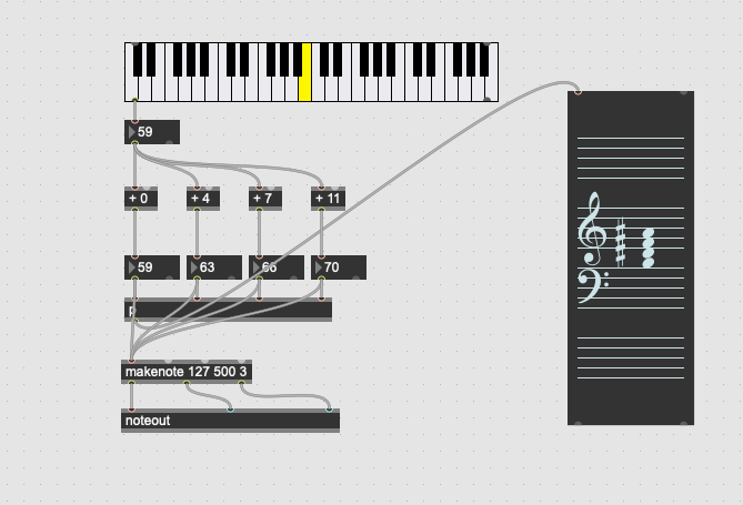 이 때 MIDI Input을 다음과 같이 number들로 각기 더한 다음 흩어저 있는 number box에 집어넣어 다시 makenote object으로 모아 pitch들을 특정 velocity와 length로 설정해두어 noteout object으로 음을 내보내면 kslider의 건반 하나를 눌렀을때 화음과 같은 여러개의 음을 동시에 내보낼 수 있다.