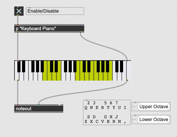 이 때 직접 마우스로 kslider에 있는 건반을 클릭하여 음을 생성하기 귀찮을 때 키보드를 사용하여 건반을 클릭하는 방법이 있다. 이때 p "Keyboard Piano" 라는 object을 사용하여 kslider에 연결하면 각각의 키에 해당되는 음이 나오는 것을 알 수 있다. 해당하는 키들은 아래 사진에 있다.