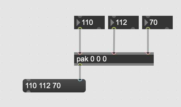 Pak Object - pack은 이제 어느정도 감을 잡았겠지만 Pak은 아마 처음 보는 것일 것이다. pak은 pack의 스페셜한 버전으로써 모든 inlet들이 Hot Inlet 으로 표시된다. 그렇게 됨으로써 어느 inlet에 연결된 number이냐에 상관 없이 무조건 값을 수정하면 곧바로 전부다 결과로 도출 되어지는 것을 알 수 있다.