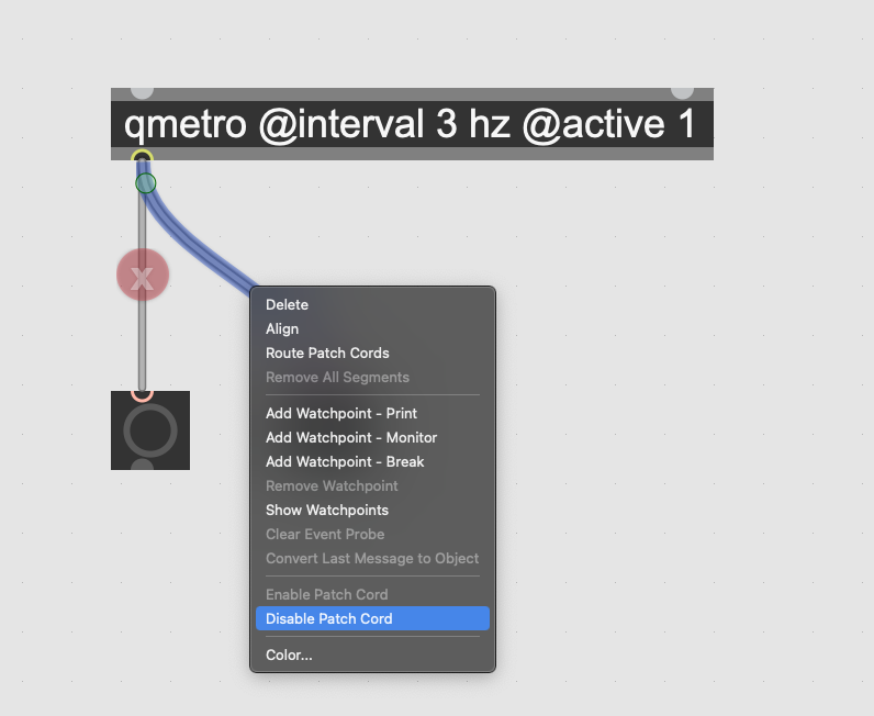 또한 Max에서는 patch의 연결을 disable하려고 할 때 다음과 같이 진행이 가능하다. Unlocked patcher에서 Patch Cord 즉 object들끼리 연결된 선을 클릭한 다음 우클릭하여 Disable Patch Cord를 선택하면 일시적으로 해당 Patch Cord의 작동을 불가하게 만들어 줄 수 있다.