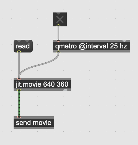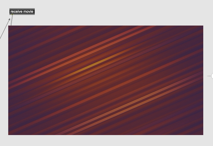 또한 아래에썬 send object을 사용하여 영상 파일을 내보내는 역할을 하였다. 이는 recieve object으로 받아와 나중에 알아볼 윈도우 창을 생성해주는 object으로 연결하면 본격적으로 비주얼 자료들을 시각적으로 볼 수 있다. 이때 send object은 딱히 outlet의 연결 없이 멀리 떨어져 있는 (심지어 다른 탭에 있는) recieve object으로 불러와 생성시킬 수 있다. 이 때 중요한점은 send 와 recieve안에 들어가는 argument의 단어들이 같아야 각기 내포하는 동일한 파일들을 불러와야 한다 (e.g. send movie -> recieve movie).