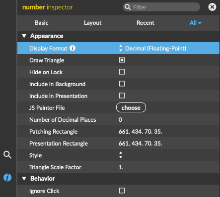 예를 들면 만약 비디오의 다른 프레임을 재생시키고 싶으면 frame 82라는 message를 연결하여 클릭했을 때 해당 프레임으로 이동하게끔 만들어 줄 수 있다. 반면 또한 비디오를 다시 처음부터 재생시키고 싶을때 time 0 이라는 message를 연결하여 클릭했을때 첫 장면부터 다시 재생하게끔 만들어 줄 수 있다. 이 때 vol이나 time_secs와 같은 메세지들은 integer값을 받지 않는다. 이 때 float 값을 number box로 생성시키기 위해서는 F키를 클릭하거나 number box의 inspector에 들어가 Display Format 카테고리를 Decimal로 바꾸어 소숫점들을 받아들이는 number box를 생성해 줄 수 있다.