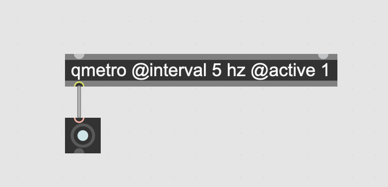 아래와 같이 qmetro에 다음과 같은 attribute를 설정하여 보았다. 이는 @interval를 통해 1초에 5번 qmetro가 button에게 bang을 전달하고 @active를 통해 자동으로 켜지게끔 설정하였다.