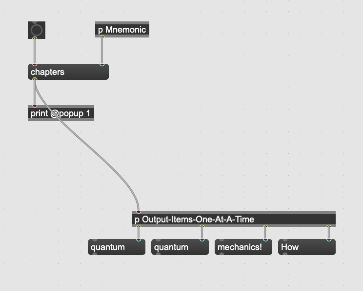 아래에서의 예시는 p Mnemonic이라는 Object을 사용하여 특정 단어들을 생성하게끔 설정해준 다음 Message box의 왼쪽 inlet에 연결된 Button이 클릭되었을때 p Mnemonic에서 생성된 단어를 message로 읽어와 프린트할 수 있게끔 설정해주는 예시이다. 이때 또한 Message를 p Output-Items-One-At-A-Time이라는 Object으로 연결하여 연결된 message들에게 이전 message로 불러들여지는 단어들을 하나하나 열거된 message로 입력될 수 있게 하는 Patch를 구조해보았다.