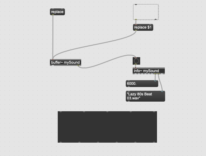 replace message를 통해 buffer~에 오디오 컨텐츠를 집어넣을 수 있으며 (또는 dropfile object을 통해 replace의 inlet에 연결하여 대신 오디오 컨텐츠를 집어넣을 수 있음) 이때 파일이 로딩되었을때 오른쪽 outlet을 Bang을 보내 info~ Object이 버퍼에 로드된 파일에 대한 각각의 정보 (outlet에 따라 다름)를 알려주게 만들어 message로 입력될 수 있게끔 만들어 줄 수 있다. 이 때 buffer~의 컨텐츠가 어떻게 재생되는지 알고 싶을때 buffer~를 더블클릭하거나 waveform~ object을 활용하여 시각적으로 재생되는 경과를 알 수 있다. 이때 attribute으로 buffername을 집어넣은 후 argument로 buffer~의 이름을 집어넣어야 작동시킬 수 있다.