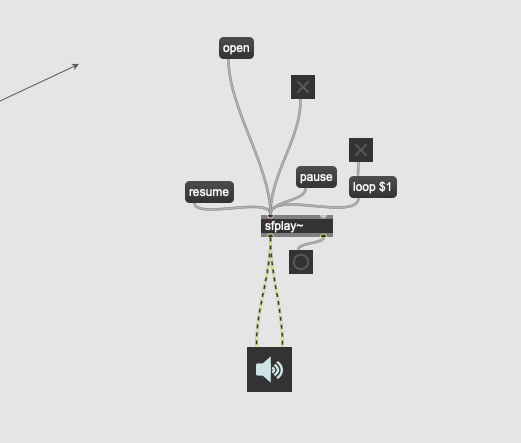 다음 예시는 open으로 불러와진 오디오 소스가 sfplay~로 연결되어 ezdac~으로 소리가 외부적으로 나올수 있게끔 설정한 구조이다. 이때 loop message를 연결하여 toggle의 결과에 따라 오디오가 반복될지 안될지 결정해주고 resume과 pause를 통해 직접 재생과 중지를 제어할 수 있도록 만들어 주었다.
