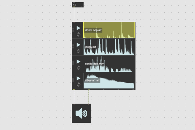 playlist~는 오디오 파일을 여러개 불러올 때 진가를 발휘하게 되는데 파일 여러개를 Patcher로 드래그하게 되면 다음과 같이 여러개의 오디오 파일들이 Stack 형태로 붙어져서 playlist~ object이 생성되는 것을 알 수 있다. 하지만 동시에 재생될 수 는 없고 하나의 오디오만이 재생될 수 있다. 하지만 이때의 playlist~의 첫번째 inlet에 number box나 message를 연결하여 몇번째에 있는 오디오 소스가 재생될지 설정해줄 수 있다. 만약 1이라는 number box를 연결하게 되면 첫번째의 오디오가 플레이되게 된다. 만약 0을 집어넣게 되면 아무 오디오 소스도 재생디지 않게 된다. 또한 playlist~는 특정 부근을 반복해서 재생하거나 특정 오디오를 지정해서 플레이 하거나 하는등의 여러가지 기능들을 제공한다.