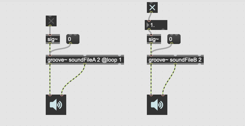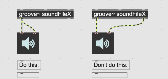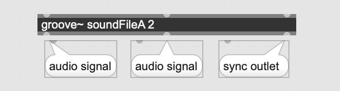 위에서 보면 play~나 groove~의 name argument 옆에 2와같은 숫자가 argument로써 써넣어져 있는 것을 알 수 있는데 이는 Signal의 수를 뜻하며 이는 유저가 오디오 파일이 스테레오 (즉 두개의 채널이 있는지)에 대한 중요한 지표로써 작용할 수 있다. 또한 가장 오른쪽에 있는 outlet은 사운드 파일이 재생을 끝냈을때 Bang을 전달하는 것으로 작동한다. 만약 play~나 groove~의 두번째 signal의 수를 나타내는 argument가 적혀있지 않다면 Signal outlet은 하나만 생성되어 (argument를 1로 작성하는 것과 동일) 가장 맨 왼쪽에 있는 outlet이 channel을 전달하는 것으로 작동된다.