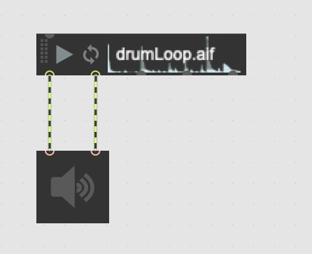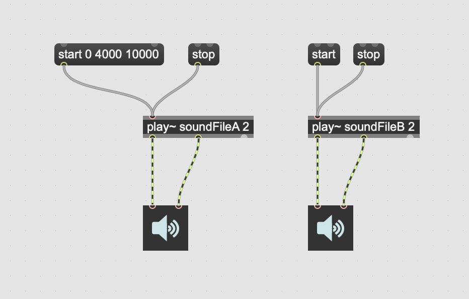 즉 특정 Audio File을 불러와 다음과 같이 연결하게 되면 양쪽 모두의 방향에서 소리가 들리는 경험을 할 수 있다. 만약 오디오 파일을 ezdac~에 연결하지 않으면 Max상에서 오디오를 재생을 하여도 우리는 오디오 파일이 아웃풋으로 나가져지는 것이 아니기 때문에 들을 수 없다. 즉 만약 오디오의 대한 정보를 다른 object에 연결하여 정보를 옮기고 싶지만 꼭 귀로 듣는 과정을 스킵하고 싶을 때에는 ezdac~을 연결해주지 않는 방법이 있다. 반면 사운드를 듣기 위해서는 ezdac~의 연결이 필연적이게 된다.