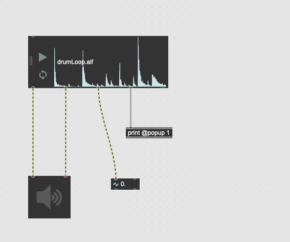 그렇다면 groove~의 sync outlet (제일 오른쪽의 outlet)은 왜 유용할까? play~는 buffer~에 담겨져 있는 오디오를 재생할 동안 (시작과 끝 포인트를 명시한다) play~에게 number box를 연결해줌으로써 buffer~안에 있는 재생되는 오디오가 현재 어느시점인지 나타나게끔 해줄 수 있다. 즉 이는 재생 파일의 현재 시간이 어디인지 알려주는 방법으로써 유용하게 쓰인다.