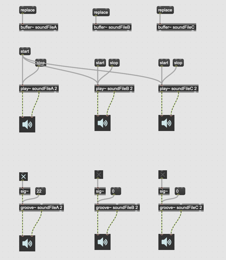 play~와 groove~는 buffer~에 저장된 사운드를 플레이 하는데 각기 다른 방향으로 유도한다. 이를 완성해주기 위해선 각각의 play~와 groove~ MSP Object들에게 buffer~의 argument와 동일하게 argument를 설정해야 작동한다. play~와 groove~ 들은 여러가지 buffer~에 저장되어 있는 오디오 파일들을 대신해서 재생시켜 ezdac~으로 전송하여 여러개가 있을 경우 동시재생을 가능케 만든다. 이 때 play~는 Max message와 함께 사운드 파일을 재생하며 groove~는 여러가지의 스피드로 사운드를 재생한다는 점에서 차이점이 있다. 이때 groove~에 들어오는 message값이 0이라면 스피드가 0이되어 재생하지 않을 것이다. 만약 play~와 groove~로 생성되는 오디오 파일을 반복하고 싶게 만들고 싶다면 loop message를 inlet에 연결하거나 @loop 1과 같이 attribute로써 object안에 써넣는 방법이 있다. (e.g. play~ soundFileC @loop1 / groove~ soundFileC @loop1)